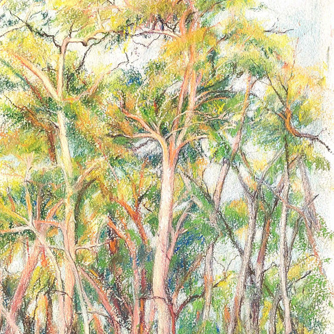 Every day I pick up a fallen leaf and marvel at the colour, or watch the late afternoon sun hit the trunks of the Lemon Scented Gums and imagine painting the lilacs, limes, pink and orange patterns made by the light. I notice that my grandkids do the same; collecting sticks, stones, and feathers that catch their eyes.